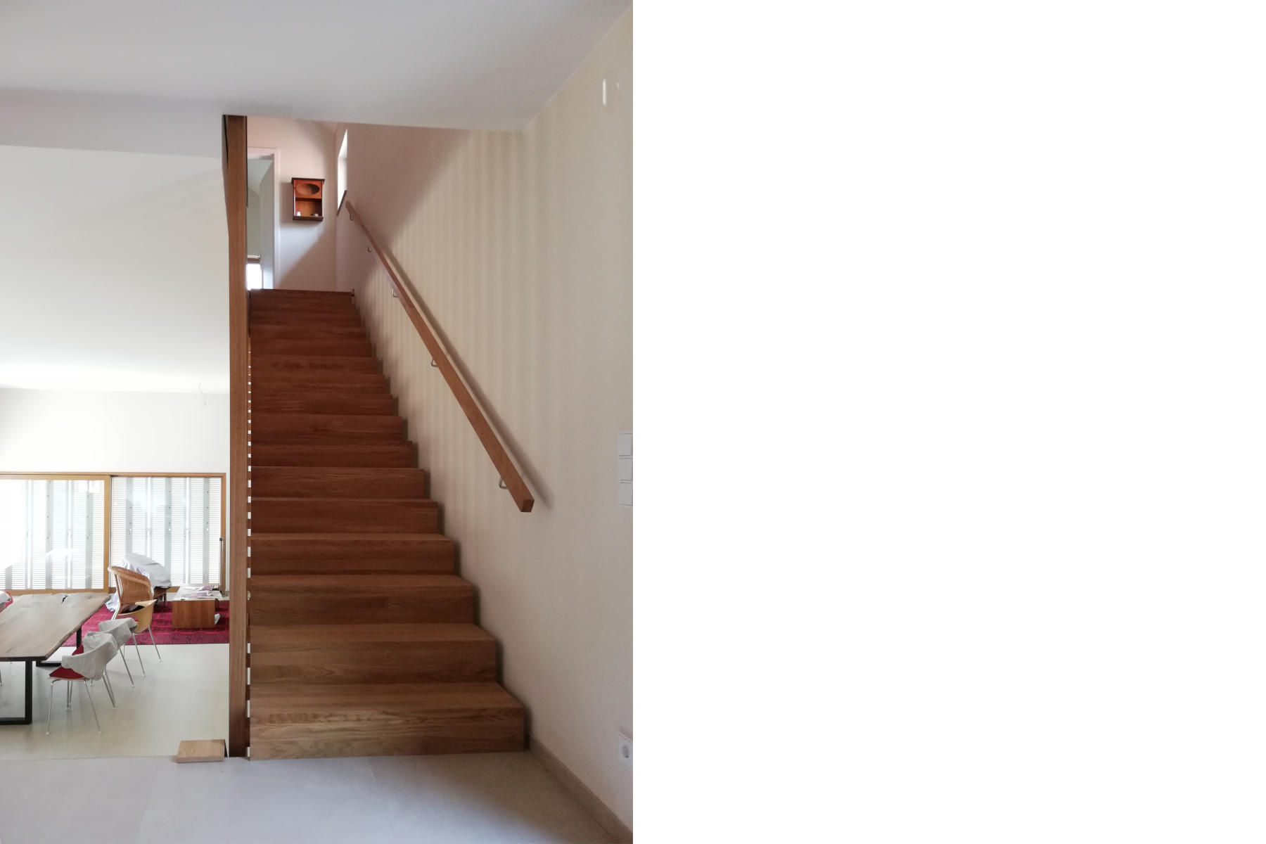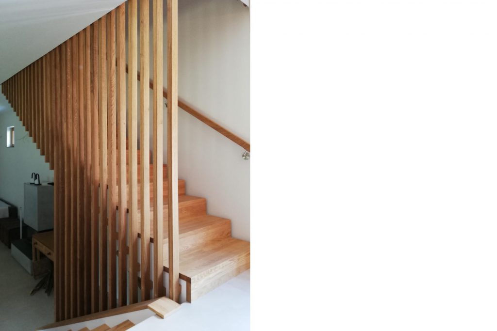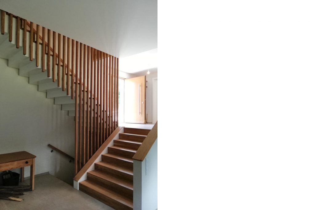 Die Topographie des steilen Grundstücks ausnutzend liegt der Eingansgbereich höher – auf Straßenniveau – als die Wohnebene welche mit einer vorgelagerten Terrasse auf Gartenniveau liegt. Im Obergeschoss befinden sich die privaten Wohnräume mit zwei Badezimmern.