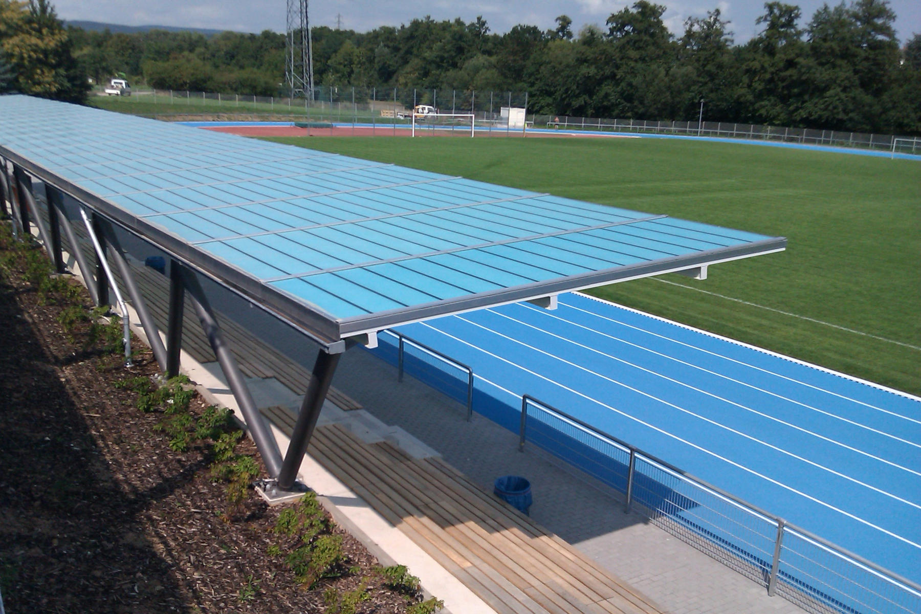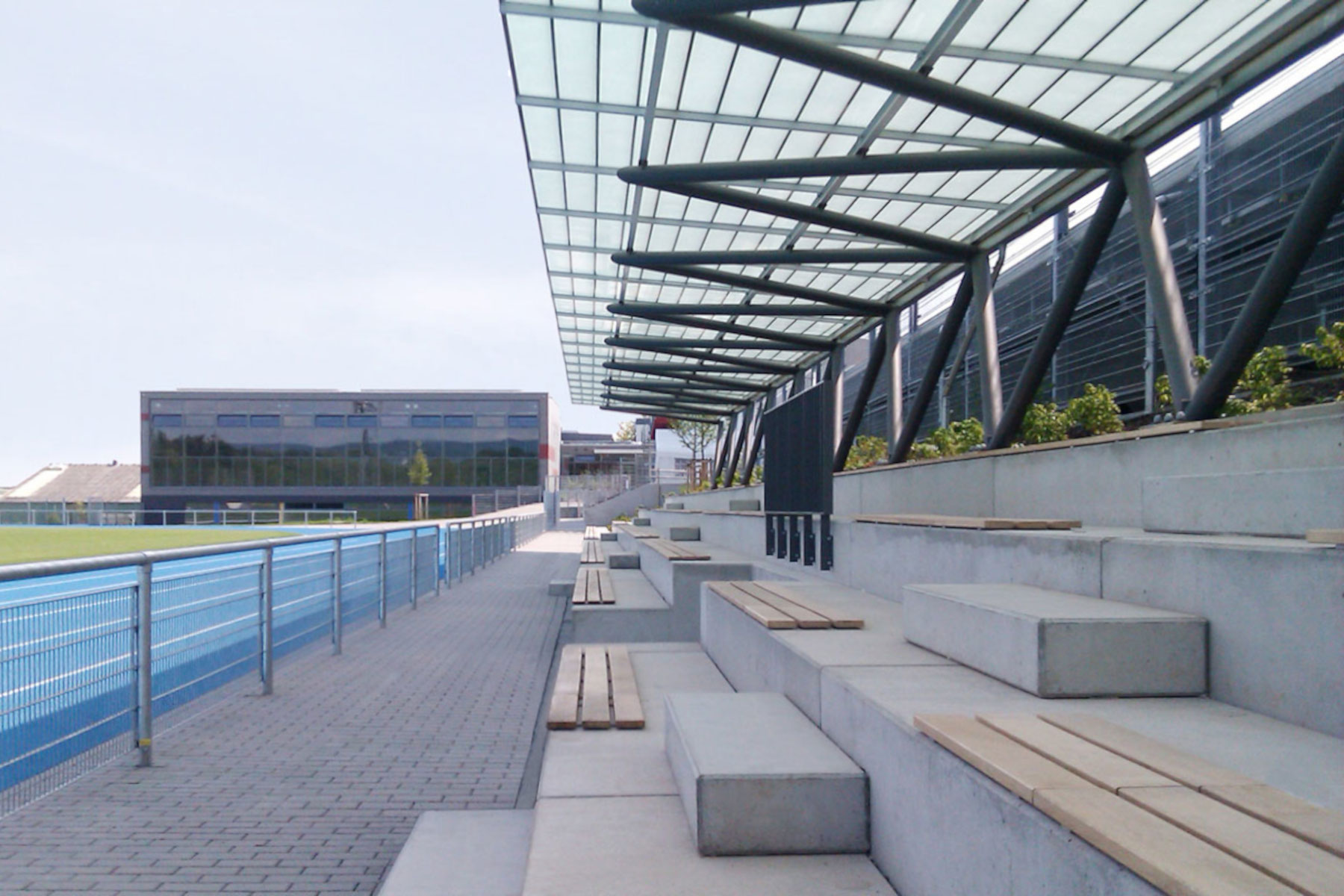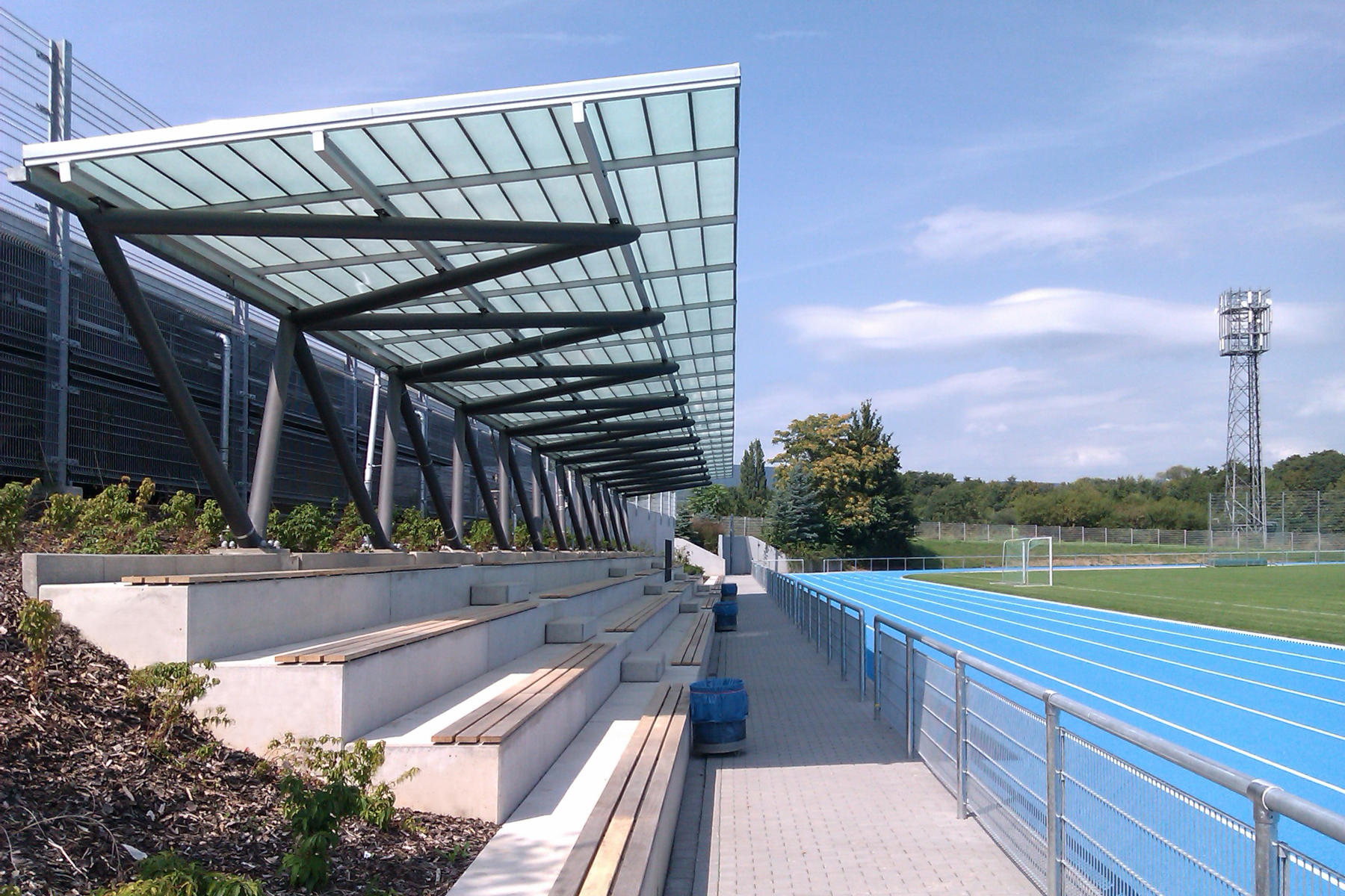 Der Neubau der überdachten Zuschauertribüne längs der großen Wettkampfbahn wurde zusammen mit einer nebenstehenden 2-geschossigen Parkpalette und einem darunter befindlichen Depotraum mit Abstellplatz für den Rasenmäser errichtet. Die Tribüne wurde als Stahlrohrkonstruktion in Form eines freitragenden Raumfachwerkes mit einer transluzenten Deckung aus Fiberglas-Elementen ausgeführt. Die Sitzstufen auf der Sichtbetontribüne wurden mit geöltem Eichenholz ausgeführt.