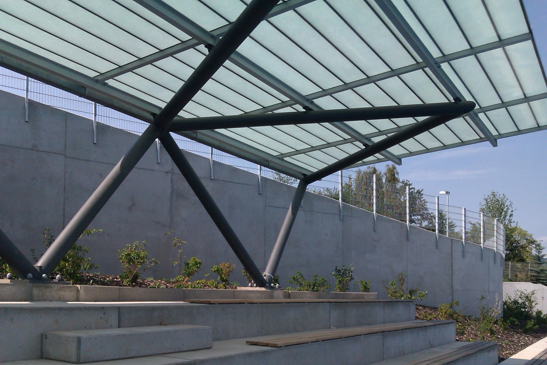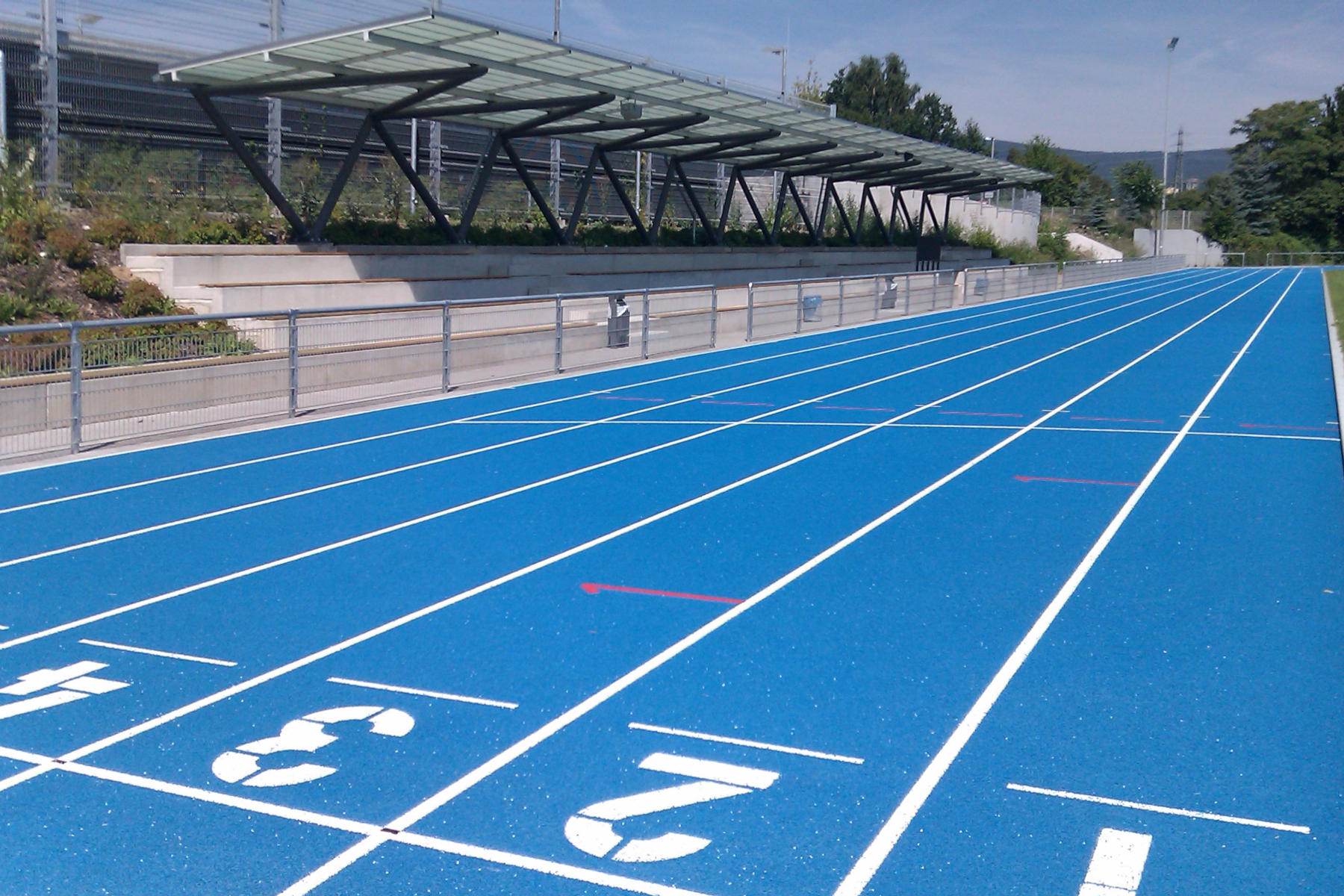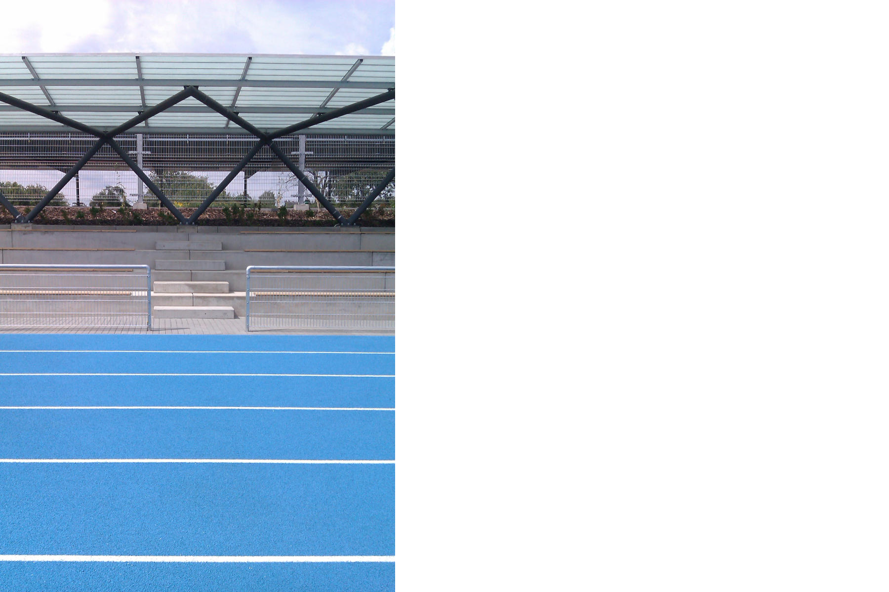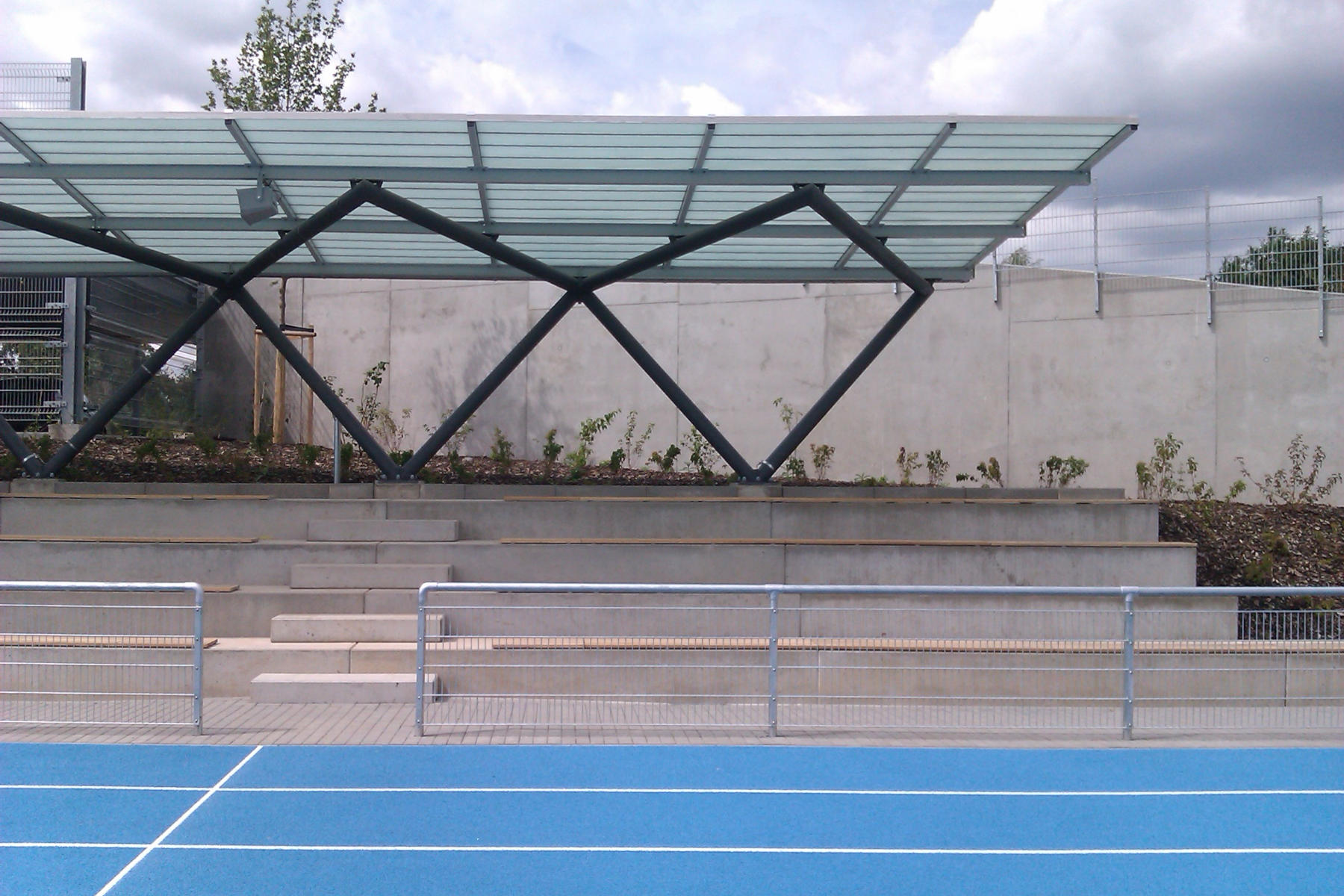 Der Neubau der überdachten Zuschauertribüne längs der großen Wettkampfbahn wurde zusammen mit einer nebenstehenden 2-geschossigen Parkpalette und einem darunter befindlichen Depotraum mit Abstellplatz für den Rasenmäser errichtet. Die Tribüne wurde als Stahlrohrkonstruktion in Form eines freitragenden Raumfachwerkes mit einer transluzenten Deckung aus Fiberglas-Elementen ausgeführt. Die Sitzstufen auf der Sichtbetontribüne wurden mit geöltem Eichenholz ausgeführt.